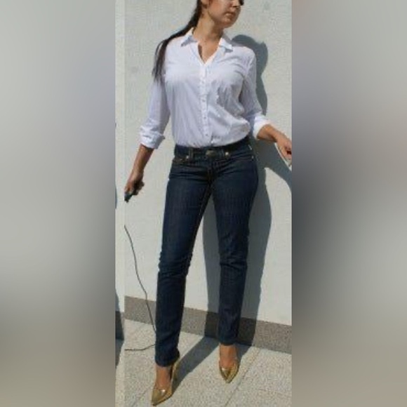 This Jean is Cut in a clean denim wash, this low-rise slim fit jean for women features sleek tonal stitching and clean chrome hardware. Finished with contrast stitching along the back pockets.