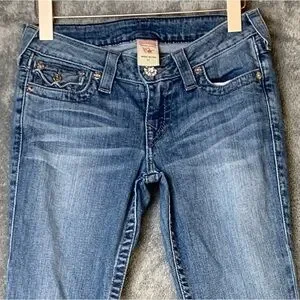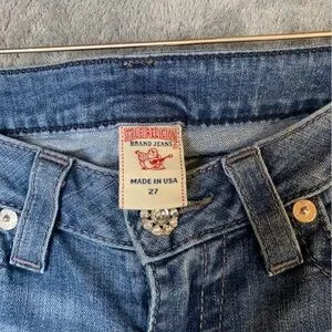 True Religion Straight Leg Low Rise Y2K Medium Wash Pink Rhinestone Buttons S 27