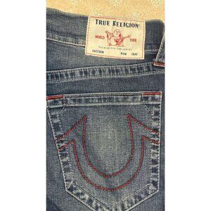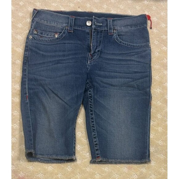 True Religion Unisex 32 Denim Shorts Blue Cut Off Red Stitch Big T Y2K