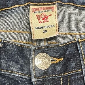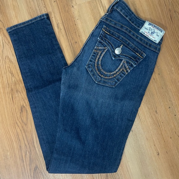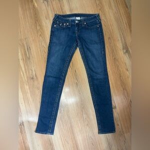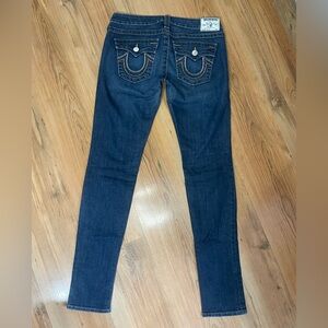 Chic dark blue skinny jeans by True Religion. Features signature stitching on back pockets. Ideal for casual wear.
