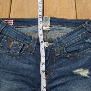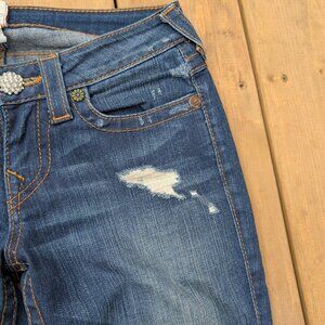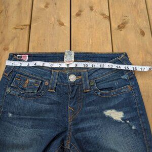 True Religion Women's Dark Wash Skinny Jeans with Embellished Buttons - Size 27