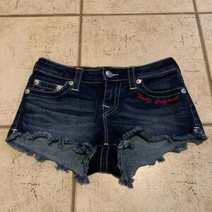 Get ready for summer with these authentic True Religion Halle cutoff denim shorts! These stylish dark wash shorts feature the iconic True Religion horseshoe stitching on the back pockets and "True Religion" embroidered in red on the front pocket, adding a distinctive touch.