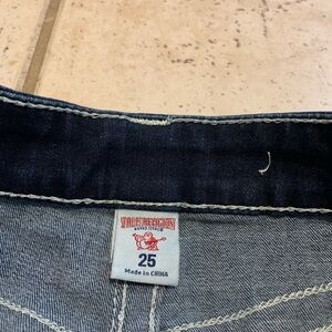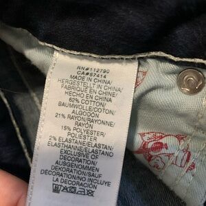 * Features: Signature True Religion horseshoe stitching on back pockets, red "True Religion" embroidery on front, button closure, zip fly, frayed hem.
