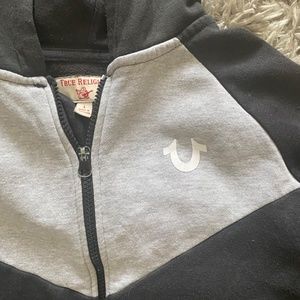 Black & grey zip up hoodie in youth large. Condition is good used condition. Has slight wash wear you often see in black hoodies. Nothing major.