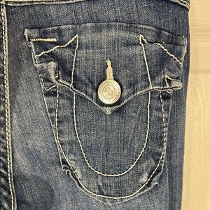 Embrace a classic look with these True Religion bootcut leg jeans in a rich blue shade. Made from premium denim, they provide a comfortable fit with a timeless silhouette. The subtle fading and natural wear patterns enhance their vintage appeal.