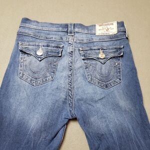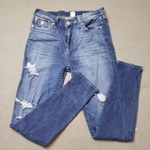 TRUE RELIGION Womens high Rise Distressed / destroyed- super skinny Blue Jeans Size 30. Soft stretch denim.