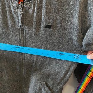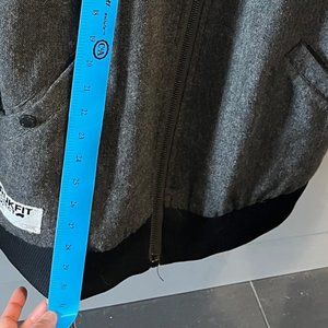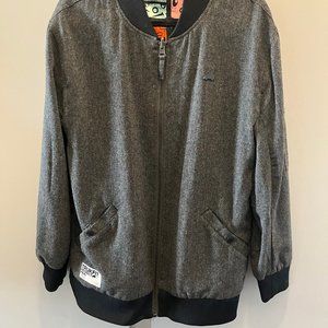 Trukfit Respect Few Men's Reversible Bomber Jacket - grey on one side & pink, red, and green cartoon print on the other. No size listed - it's either L or XL. 20" pit to pit, 31" top of shoulder to bottom of waist.