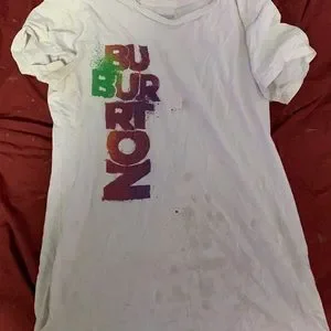 Cute white tee with writing on it! Stained a bit as shown in some of the pictures so I’m selling for a super affordable price :)