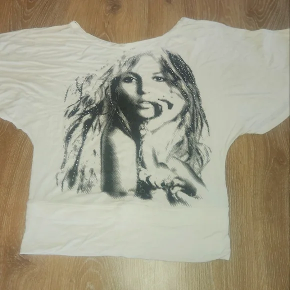 White shirt with a print of a woman that looks a little like Shakira