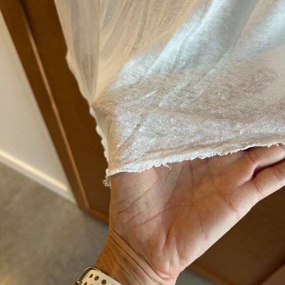 It doesn't have the manufacturing label anymore but I would say it's polyester in front and cotton in back.The seam on the back of the sweater is frayed, but it's not wear and tear, it's just the way it is (see pictures)