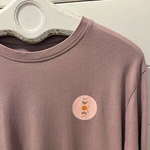 Relaxed fit t-shirt dress in a dusty mauve tone, featuring long sleeves and a celestial print on the chest. Straight cut with a soft drape, this piece offers a comfy, casual silhouette that can be worn as a dress or oversized top. 100/100 cotton Size XL.