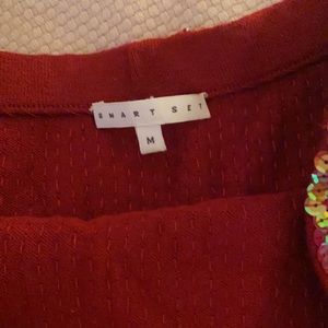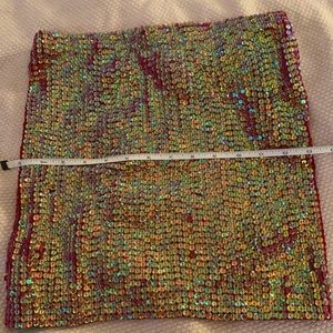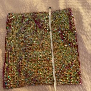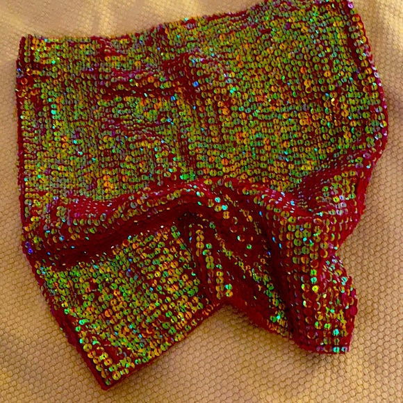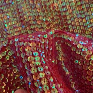 Size Medium Red tube top ( so yes it stretches) Has a light green iridescent sequin Fun for holiday!