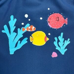 Adorable blue short sleeve rashguard swim shirt with an under the sea theme.