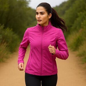 Color and Features: The jacket is a fuschia pink shade and features a full-zip front and pockets. Many Tuff Athletics jackets also include details like thumbholes and a mock neck collar.