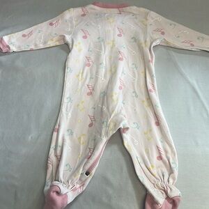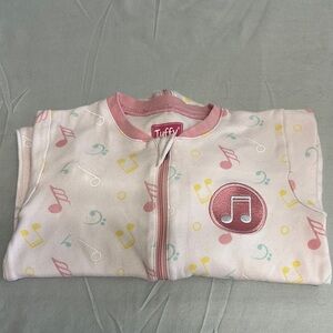 Charming Tuffy baby onesie featuring a musical note design. Accented with pink, yellow, and blue colors.