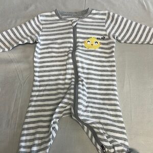 Charming baby onesie with gray and white stripes. Features a cute chick patch on the chest.