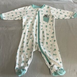 Adorable baby onesie with mint polka dots. Soft and cozy for your little one.
