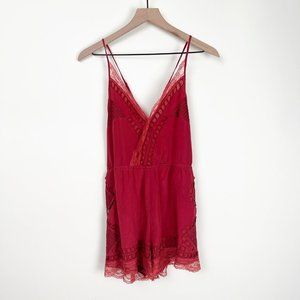 Anthropologie Tularosa Charmer Silk Romper Eyelet Lace Embroidered Jumpsuit Details: - Sleeveless silhouette - Relaxed flowy fit - Adjustable straps - Shorts style - Deep plunge surplice v-neck - Rust crushed cherry red - Can be worn two ways - Size Small Good 8/10 pre-owned condition. Tiny mark is pictured. Not very noticeable at all when being worn. will probably come out if stain treated Originally $170 USD = $244.00 CAD Style Tags: Spring, Summer, Causl, Light, Flattering, Travel, Vacation, Cute, Picnic, Everyday Wear, Comfortable, Y2K, Retro, Vintage Inspired, Sundress, Sundress, V-Neckline, Criss Cross, Brunch, Party, Birthday, Event, Festival, Concert, Date Night, Patio Drinks, School, Boho, Bohemian, Hippie, Cut Outs, Cutouts