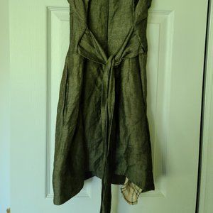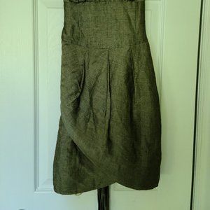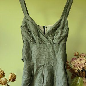 Beautiful 100% linen dress in a grey with a bit of a sheen (grey/silver) from Annabella Ramsay (purchased in Australia). Features a layered tulip-like skirt, fitted bodice with tie in the back to adjust, and straps. This dress has been worn a few times, but please note the photos of a bit of loose stitching and a rip on one side of the inner skirt lining. The cotton liner could be stitched back up but I haven't gotten around to it. Pls lmk if you need dimensions or have questions.