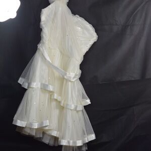 This dress is an off white, not quite white but maybe a light cream. It is netted with soft tulle and accented with sequins on the bodice and ribbon accented on the layers. Sz 4 Laura Petite. Any discoloration you see is the lighting.