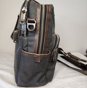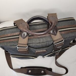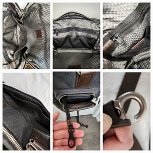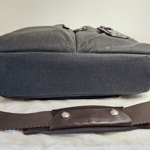 Dark Grey Canvas Alpha Bravo multi pocket Tote Messenger Bag with dark brown Leather Trim & handles and 50" long Adjustable Shoulder Strap, 'Everett Essential' by Tumi.