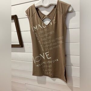 Sleeveless taupe tunic-style tank dress by Message Factory, made in Canada from a soft and eco-friendly blend of 47% TENCEL, 47% recycled polyester, and 6% spandex. This comfortable and stretchy piece features a motivational French-English text print: “Imagine que tu peux… j’aime, tu aimes…”, and a racerback design with a cute cutout at the back. A casual piece with meaning – great for lounging or layering!