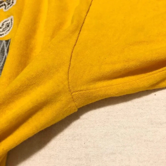 This shirt is pre-owned and in used condition. There is some wear to the graphics on it. There are a couple small stains on the back. And some loose threads on it. Please see all photos for exact item.