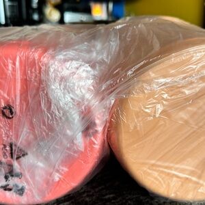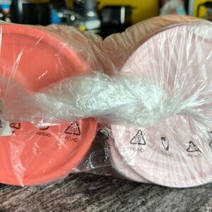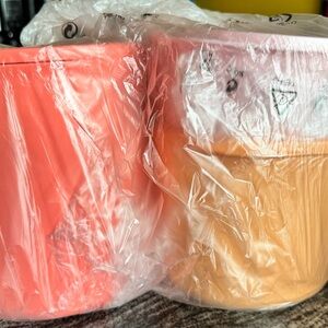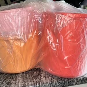 Set of three stackable storage containers in pink, orange, and coral. Perfect for organizing your kitchen. Brand new in packaging. Not available currently from Tupperware. Get yours here now!