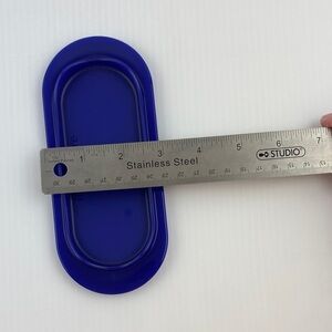 Tupperware Butter Dish with Cover. Solid ocean blue colour. Cover = 5079A-1. Base = 5080A-4. Approx 6.5 inch long by 3 inch wide. Two inch tall.