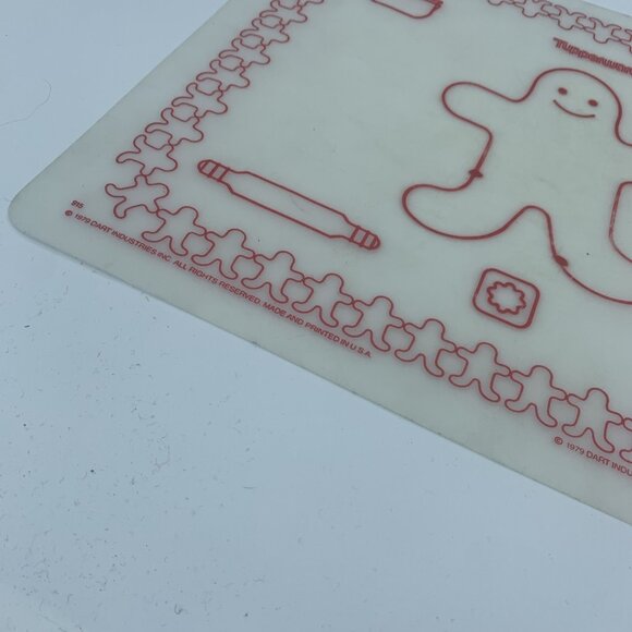 This vintage Tupperware baking mat is part of a child’s play set, designed to let kids enjoy a fun and creative baking experience! Featuring a cheerful gingerbread man outline and playful illustrations of baking tools, this flexible plastic mat measures approximately 9 inches by 11 inches. Perfect for pretend play, it inspires kids to “bake” and decorate their own cookies. This durable, easy-to-clean mat is an adorable addition to any play kitchen.