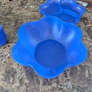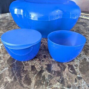 Tupperware Chip 'N Dip Bowl with Dip Cups Sapphire Blue Missing one lid