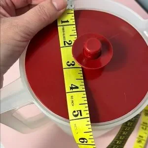 Stylish pitcher with a bold red lid. Perfect for serving drinks. Great used condition. Clear with red lid. See photos for measurements.