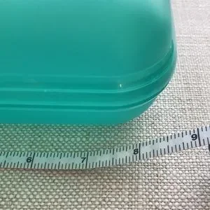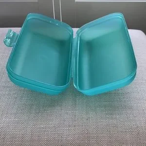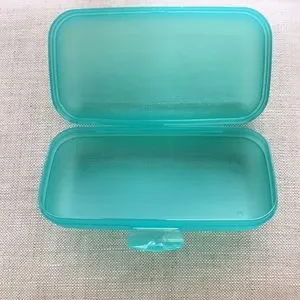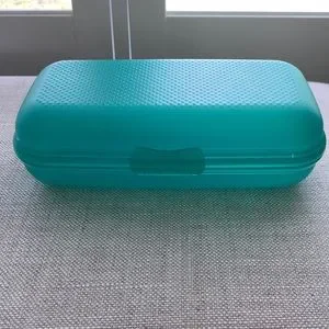 Tupperware container with snap closure. Translucent green. Great for anything between subway sandwiches to pens/pencil crayons!