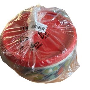 Set of three holiday-themed storage containers with red lids. Features a blue background with green and white tree patterns. NWT