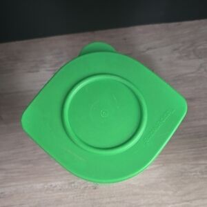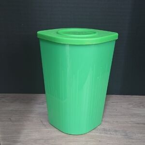 Vibrant green plastic storage container with a matching lid. Perfect for kitchen organization.