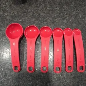 1/8, 1/4, 1/2, and 1 tsp, and 1/2 and 1 Tbsp measuring spoons.