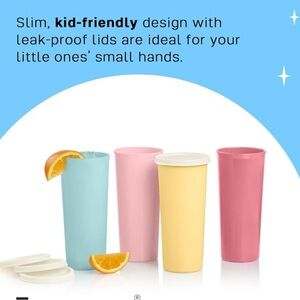 Vibrant Tupperware drinkware set. Includes pink, blue, and yellow tumblers with white lids. Perfect for any occasion. Durable, spill proof, NWT