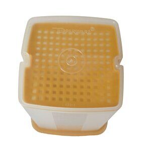 The frosted body comes with a yellow raised lid and an insert to easily lift veggies out of the container. This set is in good vintage condition with some minor age-appropriate wear.