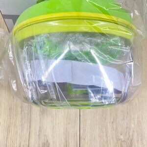 Brand New In Box/ Never Opened, Green Tupperware Quick Chef Pro Manual Food Processor. Designed to chop, mix and whisk ingredients. Includes a triple blade attachment for chopping, a paddle whisk for mixing and a graduated funnel for adding liquid, basket straining and spinning, crank mechanism. BPA Free, Easy clean. box dimension: 7" tall x 7.5" wide x 7.5" deep.