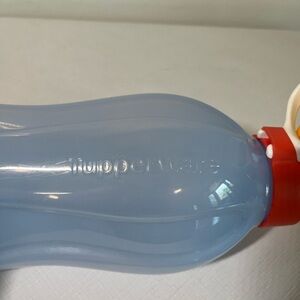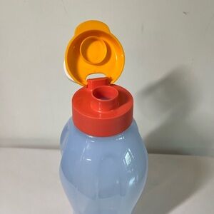 Sky blue Tupperware bottle with an orange lid. Includes a spout for easy use.