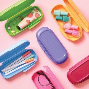 Small, hinged compact case for keeping and organizing snacks and other small personal items.