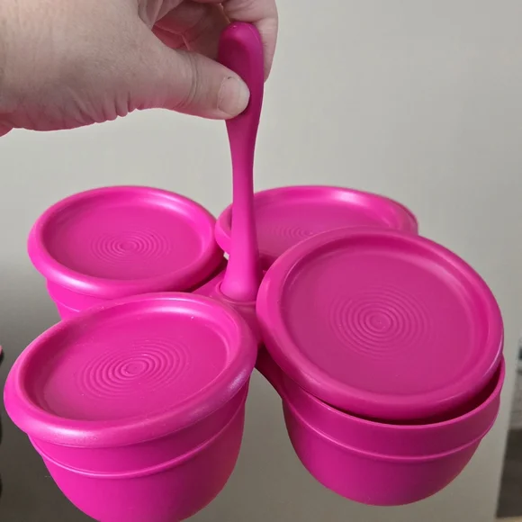 Four stackable silicone snack cups in bright pink. Each cup has a tight-fitting lid and textured top. Comes with a central carry handle for easy transport. Flexible and easy to clean.