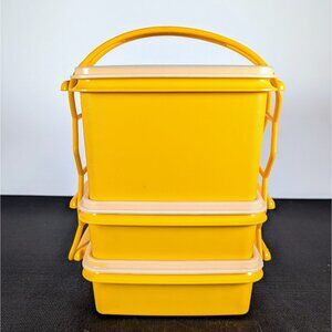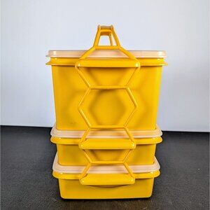 Experience the charm of vintage Tupperware with the Square Away Lunch Set, featuring six pieces that bring a touch of yesteryear to your kitchen collection. Each container in this set proudly showcases the iconic sun logo, designating its authenticity as a cherished piece from the 1362 and 1674 series. Crafted in a vibrant yellow hue, these storage containers are not only aesthetically pleasing but also practical, with each piece measuring 9 1/2 inches in height and 6 1/2 inches in both length and width. Perfect for both everyday use and special occasions, this set is a testament to Tupperware's enduring quality and style.