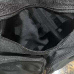 Need a sturdy bag? Constructed of Strong Nylon fabric, this bag has two outer pouches on the front, plus a zippered compartment behind those, and a large main compartment. that is divided into two sections, one being 3 inches from back to front, and the bigger one being six inches from back to front.9 inches from front to back, 15 inches wide, 13 inches tall with a flap that covers everything and a slot for the handles, which also can velcro together for ease in carrying. Lightly used, may come with a detachable shoulder strap.