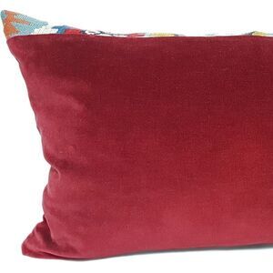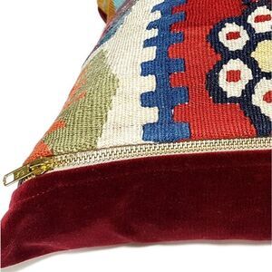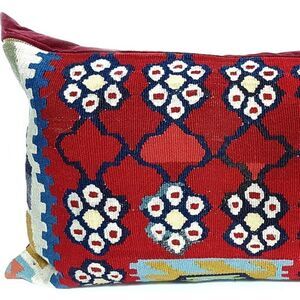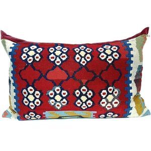 All kinds of cool going on in this Turkish Kilim Lumbar Pillow. This is a slit woven textile, beloved by collectors as this type of weave produces a very sharp-etched design, emphasizing the geometry of the weave. It’s exciting to note that there is a variation in stitch size, also a variation in the coloring of the yarn within each motif. These imperfections indicate a textile of substantial age. If you are anything like myself, you will be drawn to the character an emotion that a human hand represents. This Turkish Kilim Lumbar is very special indeed.