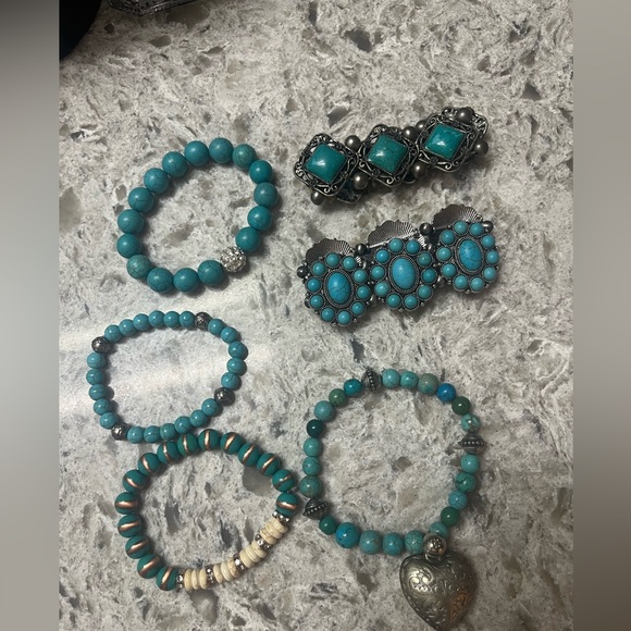 Elegant turquoise beaded jewelry set featuring bracelets and earrings. Perfect for adding a pop of color to any outfit.