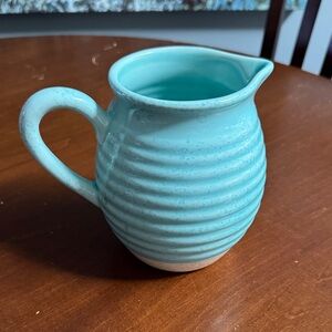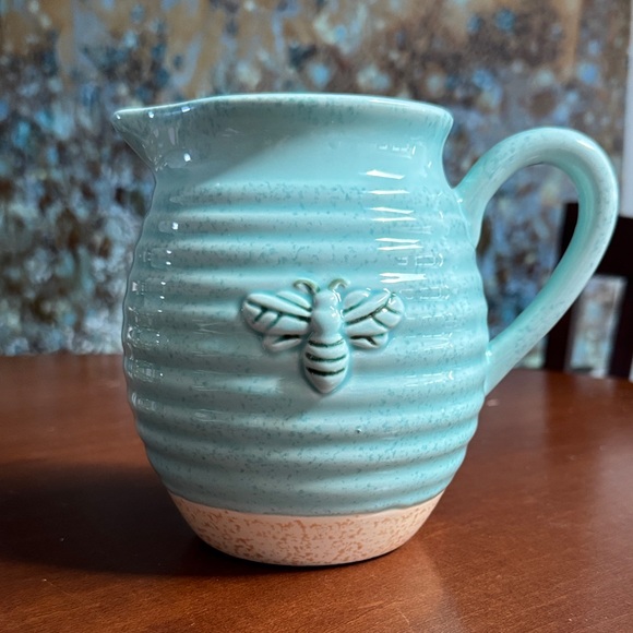 Charming turquoise pitcher with bee embossing. Perfect for serving or decor. 6” tall and the mouth if the pitcher is 4”. New condition