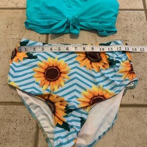 Swimsuit, Bikini, Two Piece, High Waisted, Sunflower, Floral, Chevron, Teal, Blue, Yellow, Summer, Beach, Pool, Vacation, Size M, Medium, Cute, Trendy