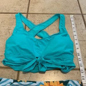 * Top: Teal solid color, criss-cross back straps, front tie detail