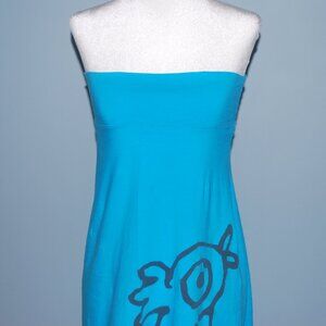 Turquoise blue transformative dress/skirt, adorned with artsy bird detailing <3 Whether worn as a dress or skirt, its vibrant colour and unique design make it a standout piece for any occasion